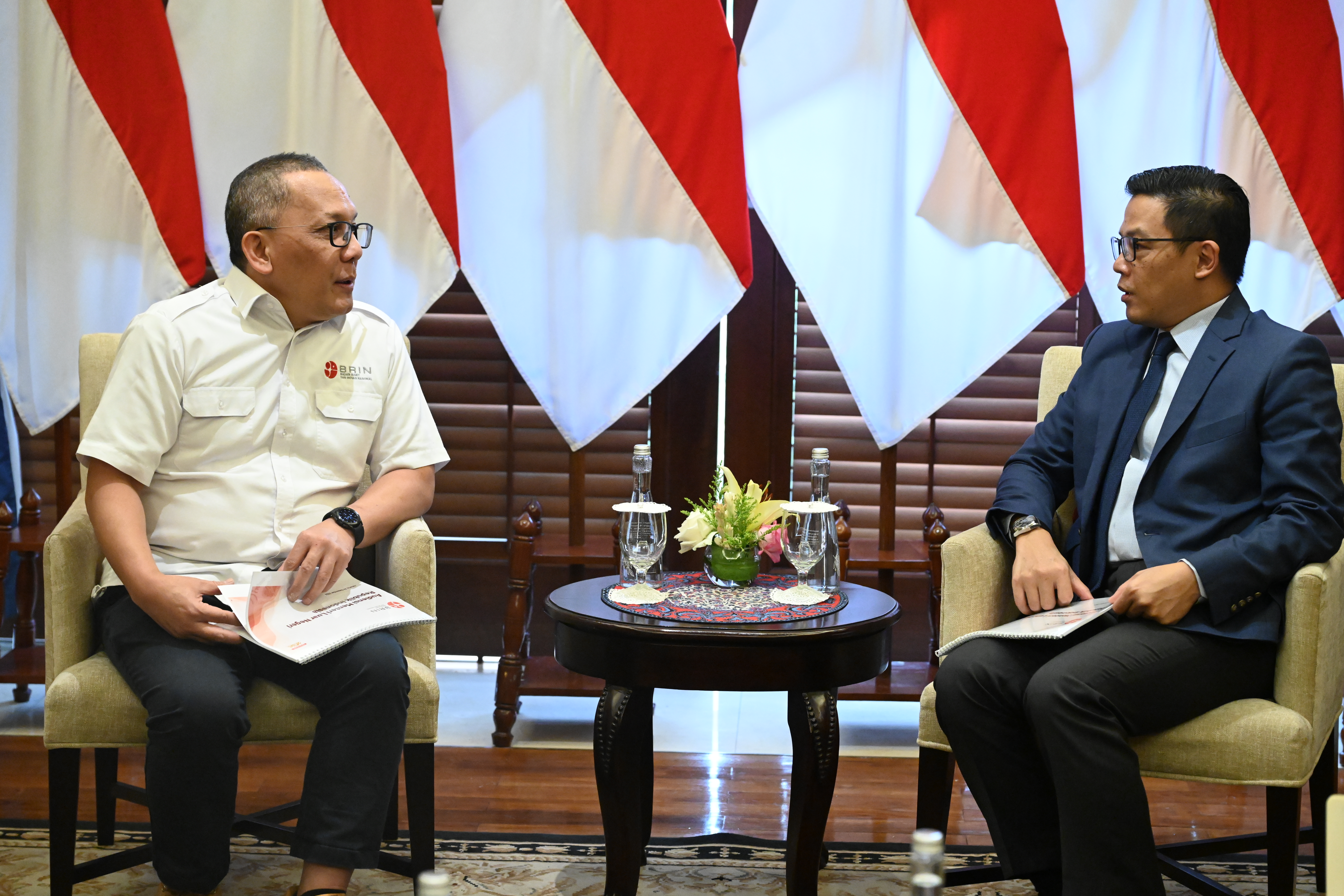 Pertemuan antara Menlu RI Sugiono dan Kepala BRIN Laksana Tri Handoko di Ruang Kaca Kemlu RI